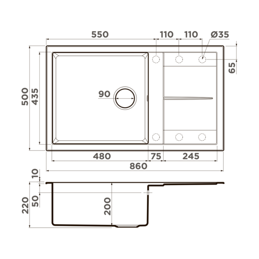 Мойка кухонная Omoikiri из коллекции Sumi 86A-GB имеет размеры 860х500 мм., изготовлена из искусственной керамики. Форма — прямоугольная, одна чаша без отверстия для смесителя. Сифон в комплекте. Ширина чаши 48. Врезной монтаж. Имеется крыло.