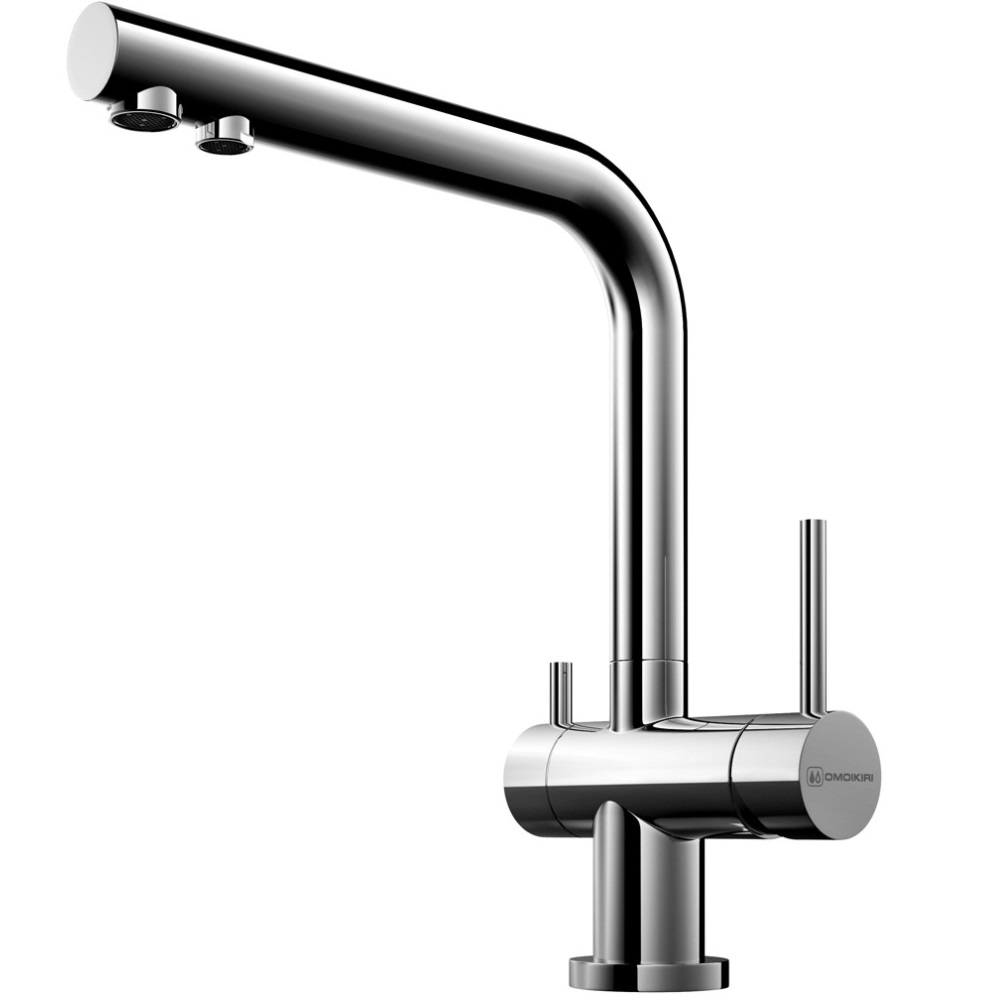 Смеситель для кухни Omoikiri Nagano с подключением фильтра оснащен рычажным управлением для регулировки температуры и напора воды. Горизонтальный монтаж на 1 отверстие. Поворотный излив 176 мм.
